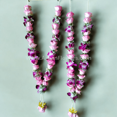This image showcases a pair of elegant wedding garlands, adorned with a stunning blend of pink roses and purple orchids. The garlands are intricately woven, creating a visually captivating and fragrant accessory for wedding ceremonies. The combination of pink and purple creates a romantic and sophisticated aesthetic.