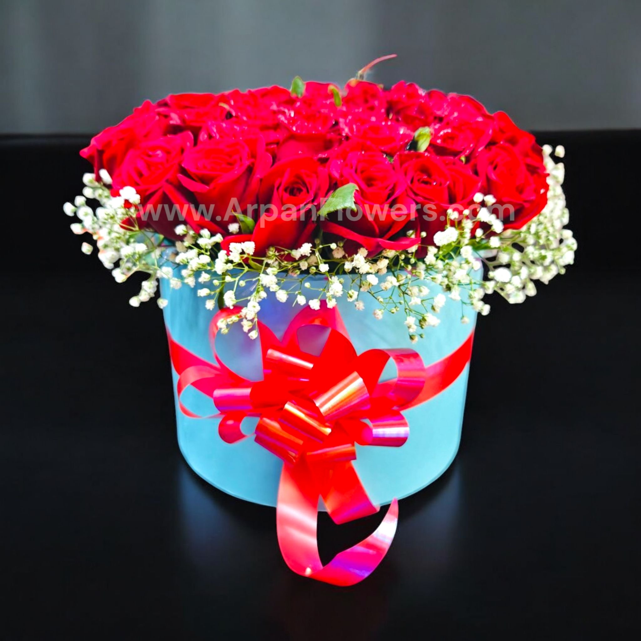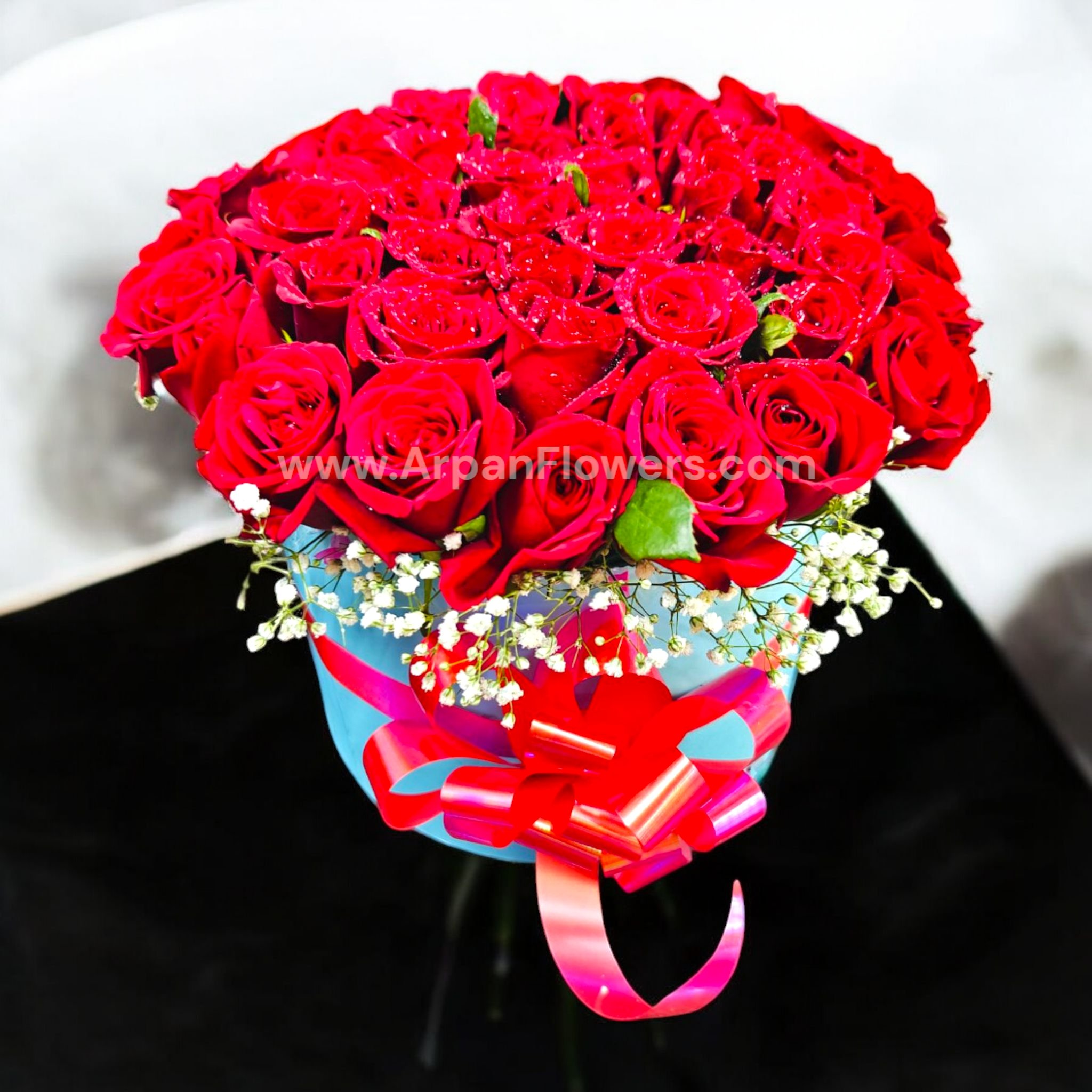 50 Rose in Box With Baby’s Breath legant red rose box bouquet: a luxurious, compact arrangement of lush red roses in a stylish box, finished with a glossy ribbon bow for a premium romantic gift.
