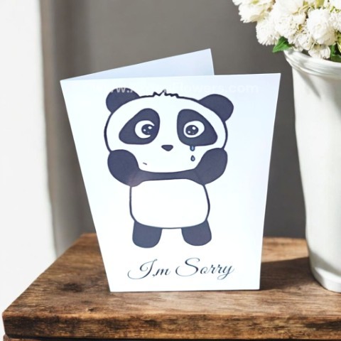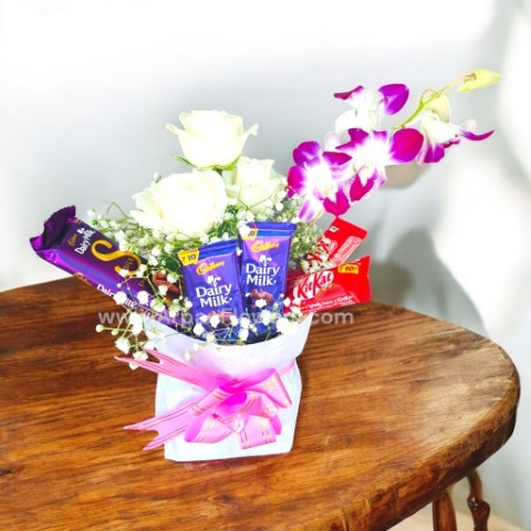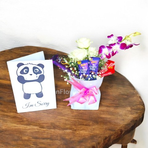 A thoughtful gift bouquet featuring white roses and purple orchids accented with chocolates (Dairy Milk and Kit Kat), all tied with a pink ribbon beside a cute “I’m Sorry” panda card.