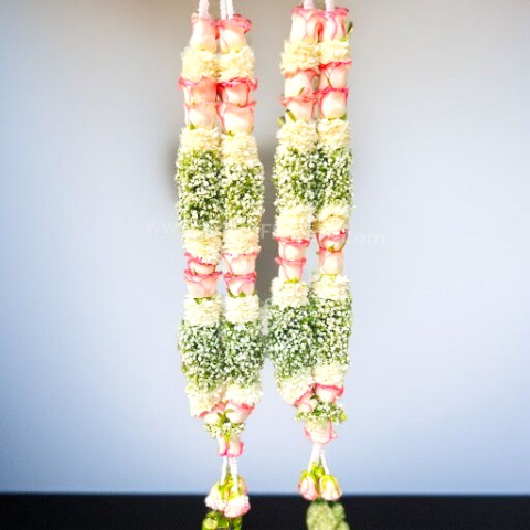 White Rose & Baby’s-breath Varmala A varmala, also known as a garland, is a traditional Indian wedding accessory used in Hindu weddings. It is essentially a string of flowers that the bride and groom exchange as a symbol of their acceptance of each other and their commitment to the marriage. The varmala exchange is a significant and joyous moment during the wedding ceremony.