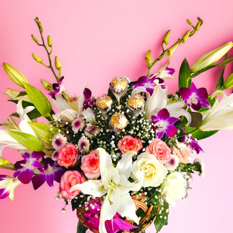 Lily And Orchid in Basket Bouquet