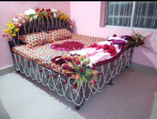 This image shows a beautifully decorated bed for a special occasion, likely a wedding or engagement. The bedspread features a colorful, geometric pattern with shades of orange, blue, and yellow. The headboard is adorned with a floral arrangement and hanging flowers, creating a festive and romantic atmosphere.