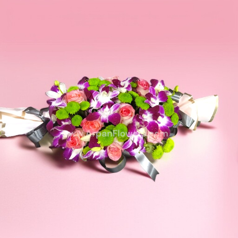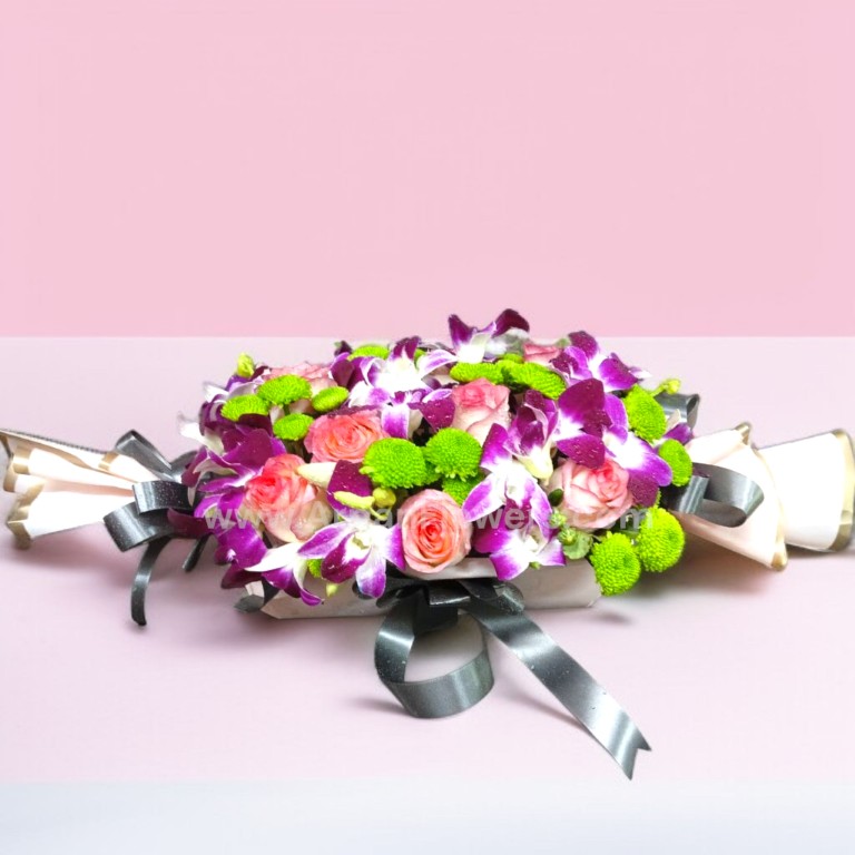 Elegant floral arrangement featuring vibrant purple orchids, soft pink roses, and fresh green chrysanthemums in a sleek rectangular container wrapped with cream material and a sophisticated gray ribbon.