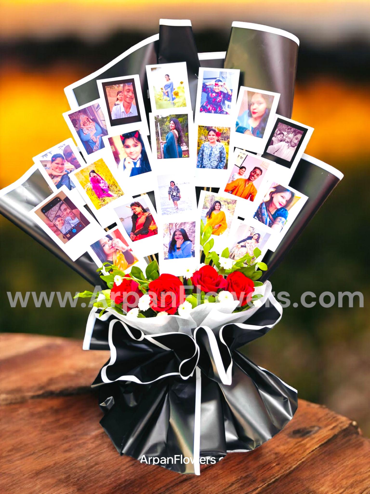 This image shows a unique floral arrangement combining printed photos and flowers. Several small photographs are fanned out and arranged in a semi-circular pattern, with some also placed in black paper cones on either side. The photos appear to feature various people and moments, possibly memories or portraits. The flowers at the base include red roses, and the arrangement is wrapped with black and white ribbon, tied into a decorative bow.