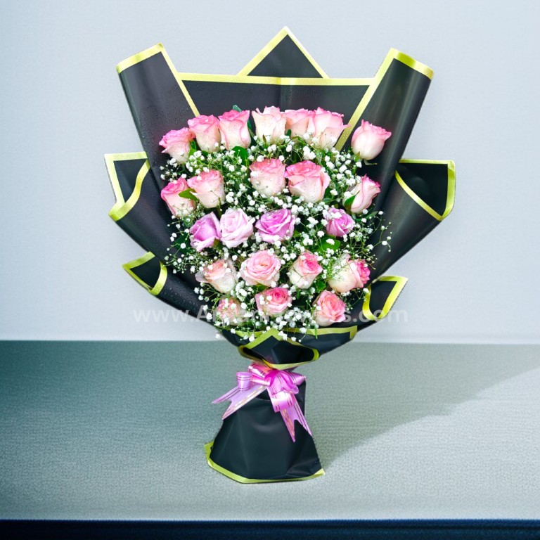 Creating a bouquet of pink roses wrapped in black paper is a stylish and modern choice that combines elegance with a touch of sophistication. Here’s how to put together this striking arrangement: