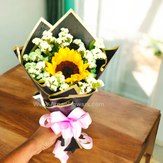 A beautifully of Single yellow sunflowers. The sunflowers are surrounded by delicate white baby’s breath, adding a soft contrast to the bold yellow. At the base, there is a decorative bow made from the same gray fabric, complemented by a Pink ribbon that adds a touch of brightness.
