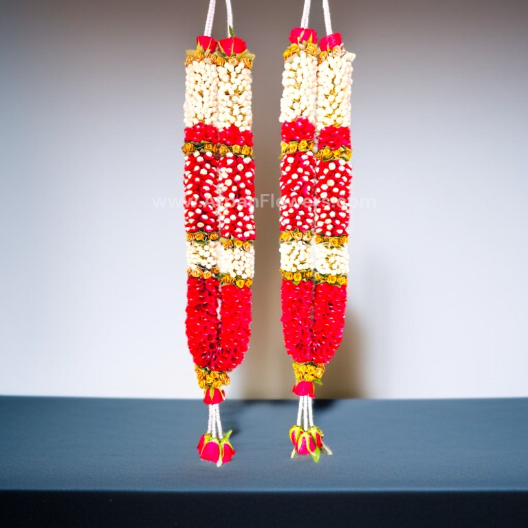 The varmala combines the white, fragrant Tagar flowers with vibrant red rose petals. The contrast between the white and red creates a visually appealing effect.