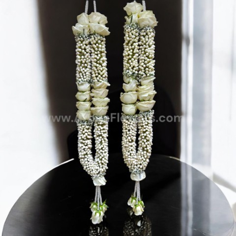 Elegant white pearl(Tagar) bead garlands with pale White roses. Handcrafted, multi-strand tassel design that drapes gracefully for weddings . Symbolizes purity, blessings, and welcome.