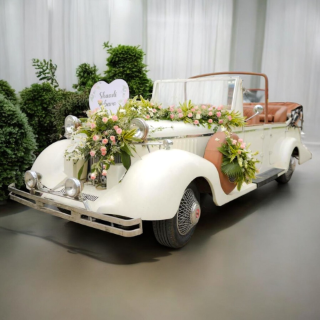 The image features a vintage white convertible car, elegantly decorated with a variety of flowers for a special occasion, likely a wedding. The car is adorned with floral arrangements, including red and white blooms, along the sides and on the front, enhancing its classic charm. The vehicle’s design showcases a prominent grille and round headlights.