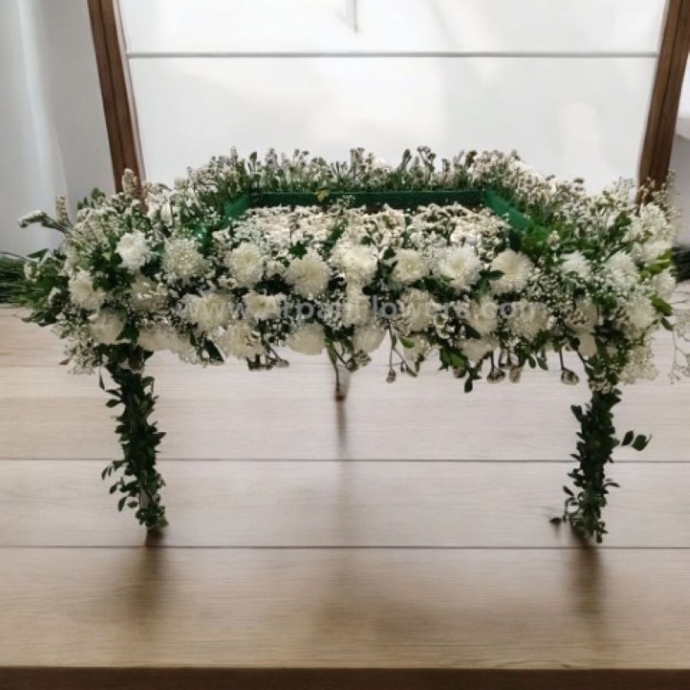 A minimalist white floral chadar — a long, rectangular arrangement of chrysanthemums, baby’s breath, and lush greenery cascading gently over a light wood surface, evoking purity and elegance for weddings or sacred ceremonies.