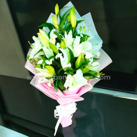 A graceful bouquet of white lilies with fresh green foliage, wrapped in soft pink and white paper and tied with delicate ribbons for a romantic, elegant presentation.