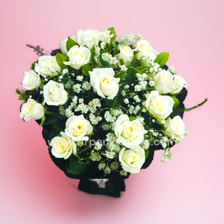 This bouquet features 16 elegant white roses, beautifully arranged and complemented by delicate baby’s breath and lush greenery. The roses are wrapped in black tissue paper, accented with a stylish white ribbon bow at the base. The overall presentation is sophisticated and classic, making it suitable for a variety of special occasions.